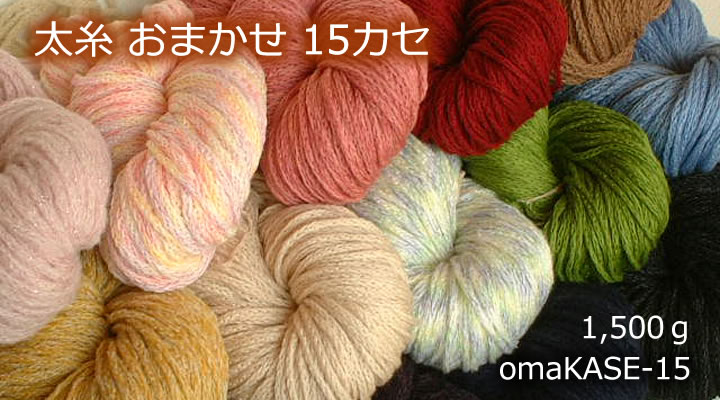 | 試作品や半端に残ったオリジナルの太糸いろいろ・おまかせで15カセ・1500g以上です。 タイトル画像は例になります。「色や種類はおまかせ」のセットです。 |